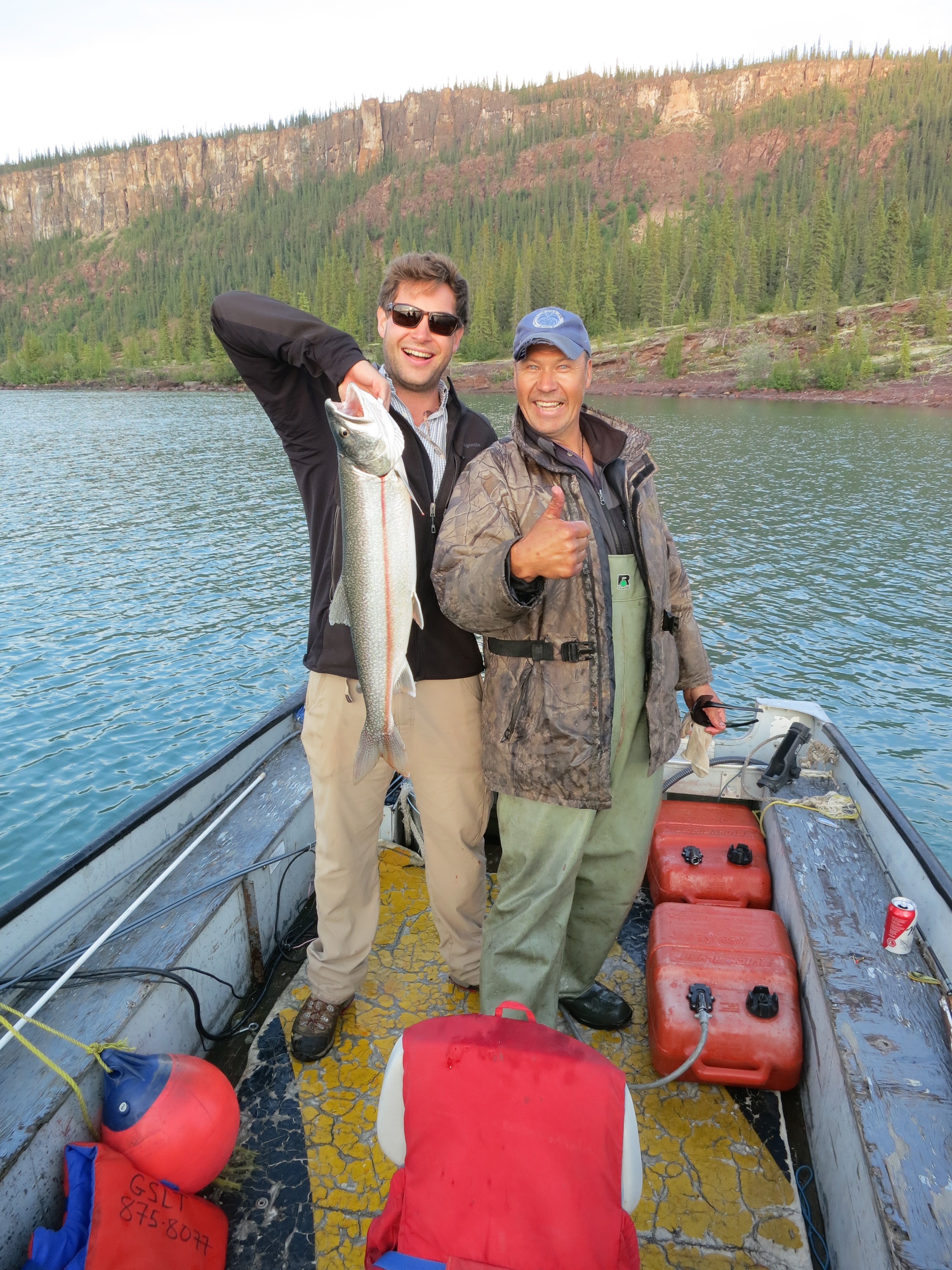 Holding a Mackinaw Trout (lake trout) on a small boat in the East Arm of Great Slave Lake, Northwest Territories, Canada