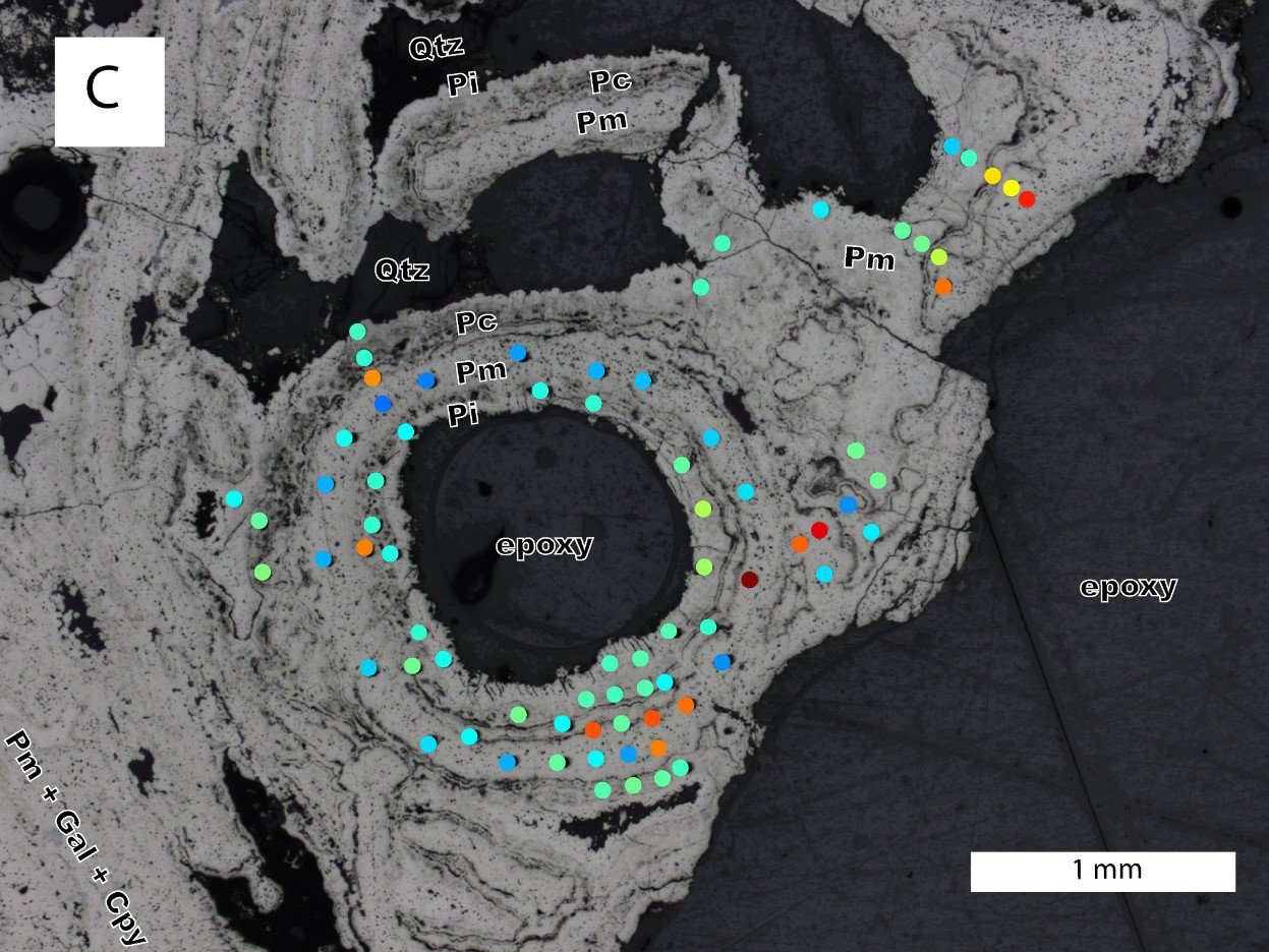 I study metal cycling during diagenesis, with diverse geobiological applications. For example, in a Mesoproterozoic base metal sulfide deposit (Belt Supergroup, MT) copper, barium, and sulfur cycling at an ancient hydrothermal vent created unique, beautiful vent structures formed as microbial life interacted with its anoxic deep-ocean environment (Present et al., GSA Bull., 2018; web/PDF). In an ongoing collaboration, I am working to understand metal sulfide aqueous speciations and their use by Earth's earliest microorganisms (Johnson, Present, and Valentine, PNAS, 2024; web/PDF).